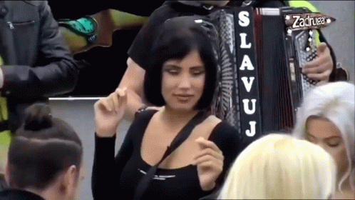Aleksandra Subotic dances with enthusiasm at the Zadruga event, while a musician plays the accordion.