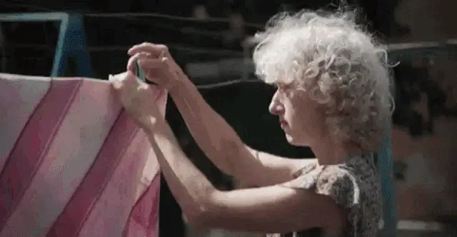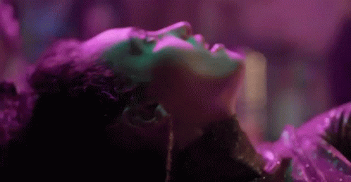 Ukrainian singer Alina Pash in a sensual pose, lying down under vibrant green and purple lights.