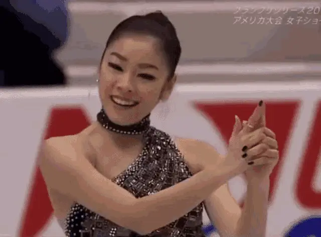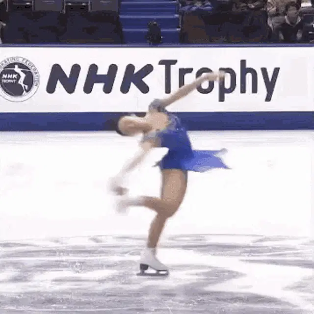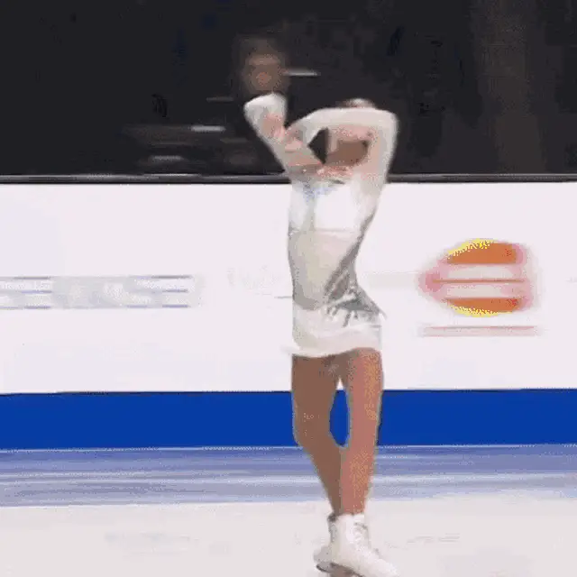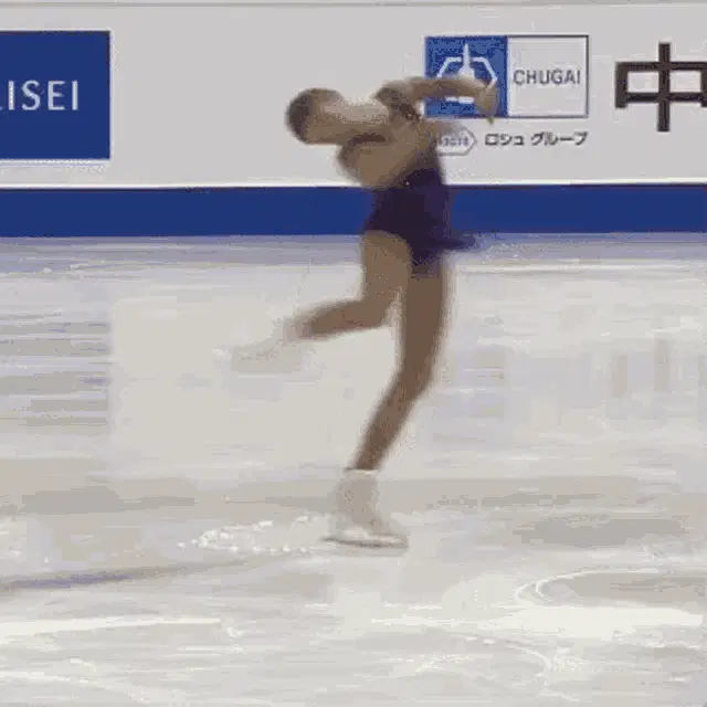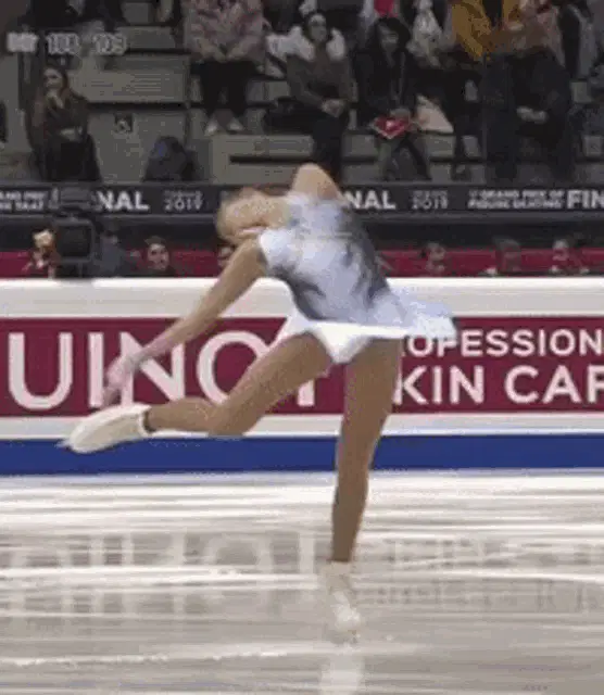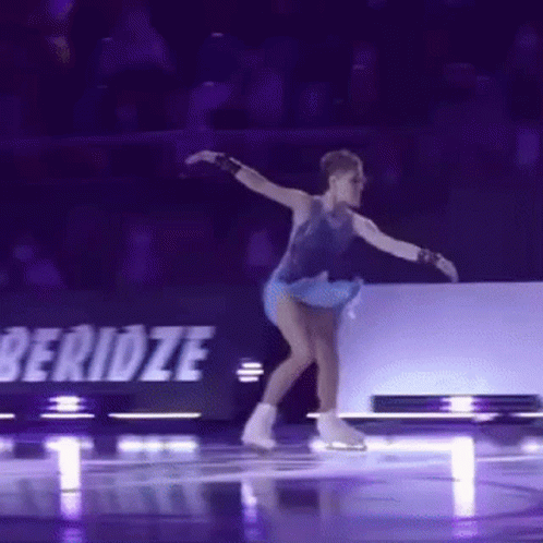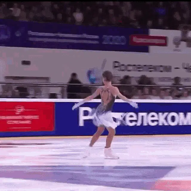 Alena Kostornaia performs a figure skating routine on an ice rink with a purple background and sponsor banners.