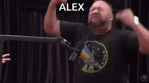 Alex Jones passionately shouts and gestures into a microphone during a broadcast.