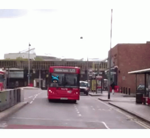 Alex, represented by an emoji, drives a red London bus (U3 Heathrow Central) down a city street.