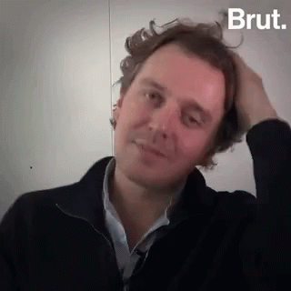 Alex Vizorek touches his hair, with the French caption "Tout est dans la mèche."
