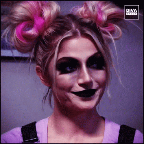 Alexa Bliss showcasing a dramatic, spooky makeup look with pink-accented blonde hair in buns.