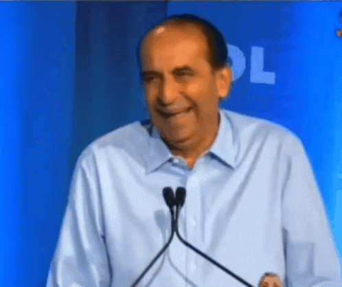 Alexandre Kaliu laughing heartily at a microphone, with a blue background.