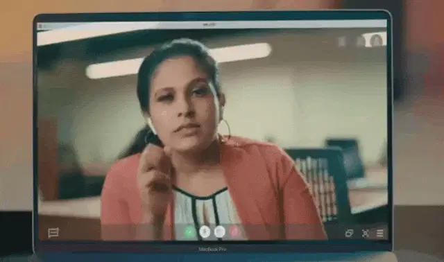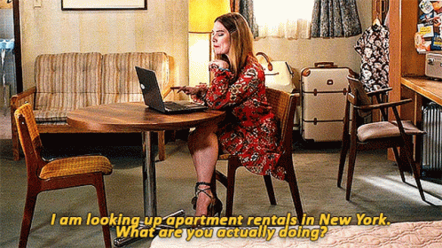 Alexis Rose (Annie Murphy) from Schitt's Creek sitting at a table with a laptop, looking up apartment rentals in New York.