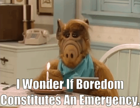 ALF, also known as Gordon Shumway, sits bored at a table, pondering if boredom constitutes an emergency.