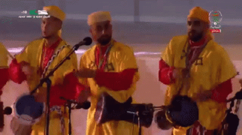 A group of men perform traditional Algerie Ragada and Oran Raggada music on stage in vibrant attire.