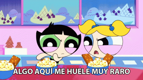Bubbles (Burbuja) and Buttercup (Bellota) look suspicious, with the caption 'Algo Aquí Me Huele Muy Raro' (Something here smells very weird).
