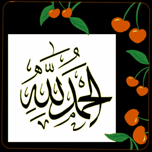 Arabic calligraphy for 'الحمد لله' (Praise be to Allah) framed by animated cherries and flowers.