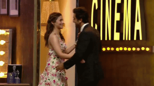 Alia Bhatt and Ranbir Kapoor share a loving hug on stage in front of a 'CINEMA' sign.