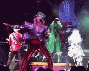 The Mad Hatter and Alice in Wonderland characters perform live on stage with a band.