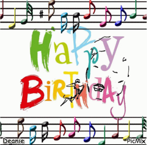 A vibrant 'Happy Birthday' illustration featuring a man singing into a microphone, dedicated to Alicia Jimenez.