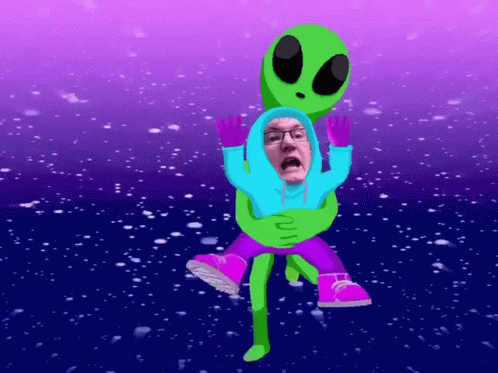 A green alien carries a man with a superimposed face in a blue hoodie, dancing in a vibrant purple space background.
