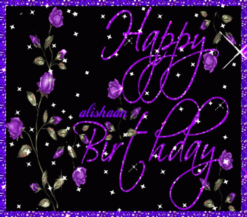 Happy Birthday Alishaan message with sparkling purple flowers and glitter on a black background.