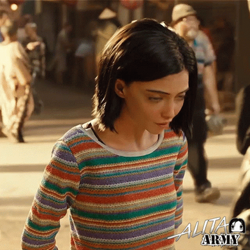 Alita, the cyborg girl, in a striped shirt, looking intently in a bustling dystopian city.