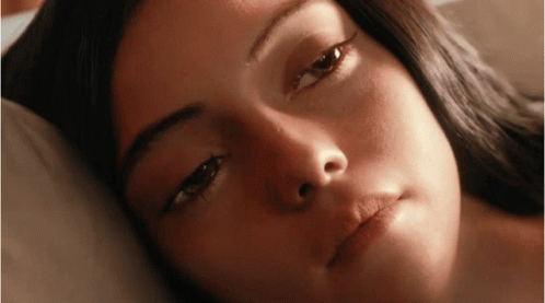 A close-up of Alita from Alita: Battle Angel, showing her drowsy eyes as she wakes up or falls asleep.