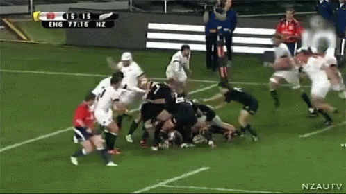 A tense rugby match between England and New Zealand, with the score tied at 15-15 in the 77th minute.