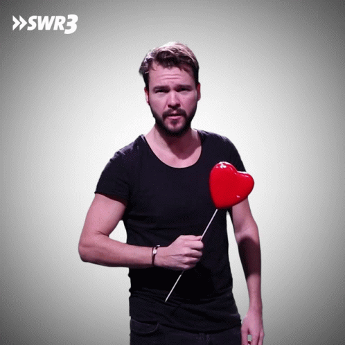 Sebastian Mueller from SWR3 holds a red heart prop, expressing 'I Love You All'.