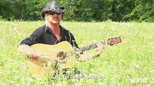 Joe Exotic plays his song 'All That Armageddon' on an acoustic guitar in a sunny field of daisies.