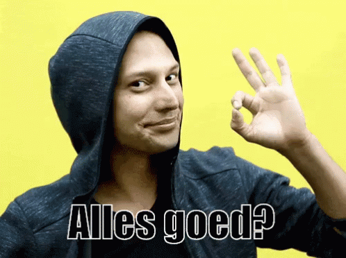 Man in a hooded jacket winks and makes an OK sign, with the Dutch text "Alles goed?" displayed on a yellow background.
