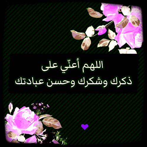 A beautiful Islamic prayer on a black background with purple flowers and hearts, asking Allah for help in remembrance, gratitude, and worship.