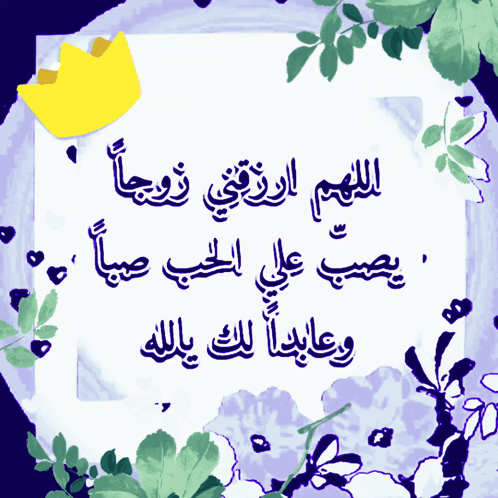 A beautiful prayer in Arabic for a righteous husband, adorned with a yellow crown and purple floral frame.