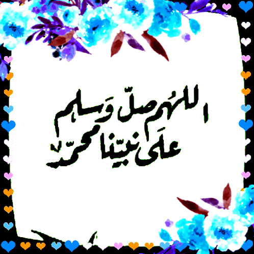 Arabic calligraphy of 'O Allah, send prayers and peace upon our Prophet Muhammad,' framed by blue and purple flowers.