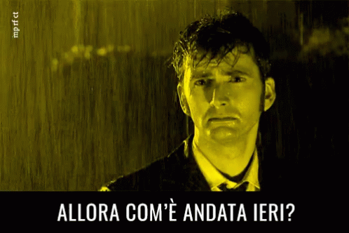A man in the rain with a sad expression asks 'Allora Com'è Andata Ieri?' reflecting a feeling of 'No Love'.