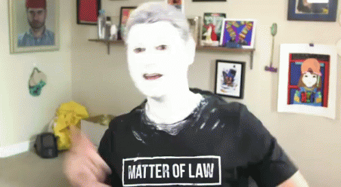 Person in whiteface, wearing a 'Matter of Law' shirt, referencing H3h3 and Jacksfilms memes.