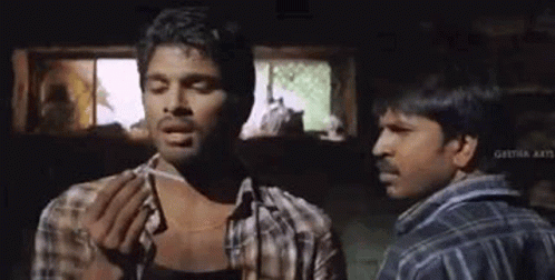 Allu Arjun's surprised reaction with the 'Abbachaa' dialogue, featuring another character in a dimly lit room.