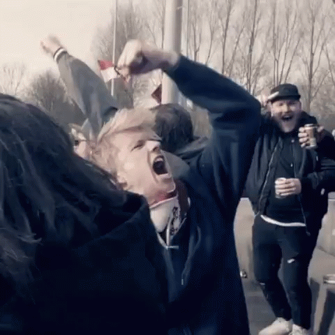 A group of young men enthusiastically cheering and celebrating, with their arms raised in excitement.