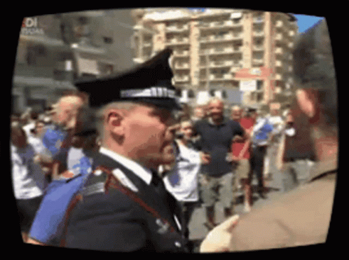 An Italian Carabiniere officer observes a crowd at a public gathering, potentially related to a Salvini event.