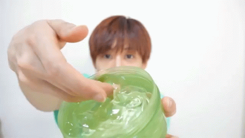 Hyuk demonstrates the texture and consistency of green aloe vera gel, showing it on his finger.
