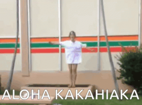 A woman in a white shirt jumps in front of a 7-Eleven, with "Aloha Kakahiaka" text on screen.