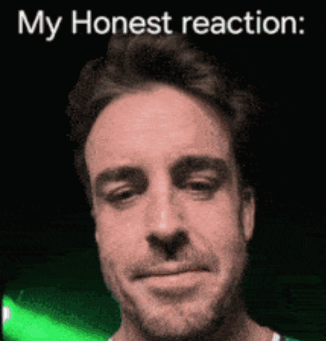 Fernando Alonso demonstrates his 'honest reaction' with the popular mewing gesture, looking thoughtful.