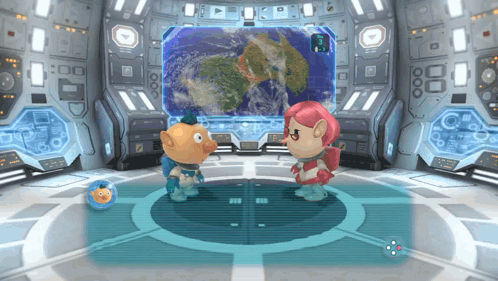 two cartoon characters are standing in front of a large screen with a map of the earth
