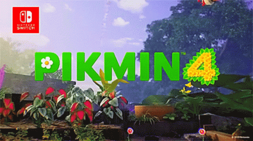 The vibrant title screen for Pikmin 4 on Nintendo Switch, featuring the character Alph and various Pikmin.
