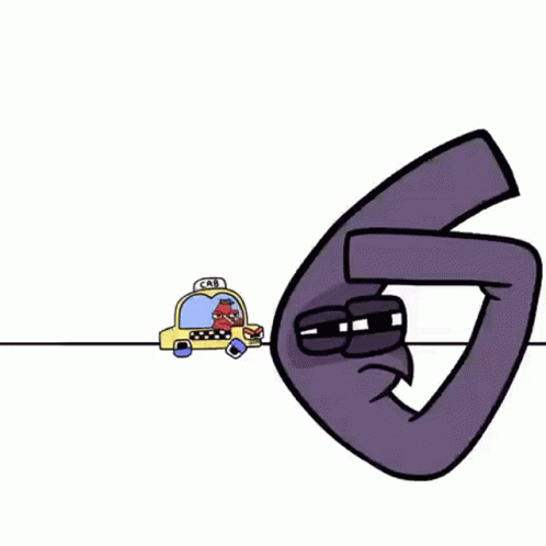 An animated purple letter G watches as a small yellow taxi cab, driven by a red character, approaches.
