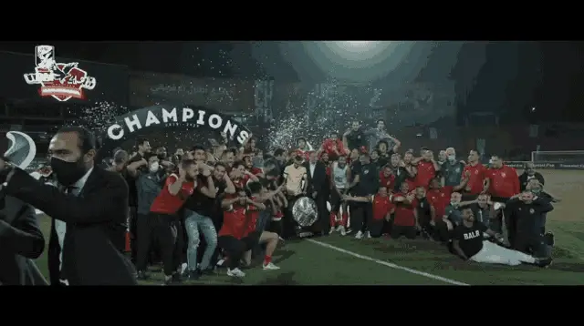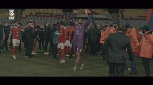 Ahly goalkeeper El Shenawy celebrates a victory on the field, raising his arms in triumph after a significant win.