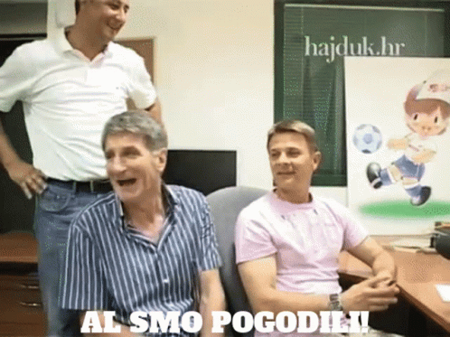 Two men laughing and celebrating, with the text "AL SMO POGODILI!" and "hajduk.hr" visible.