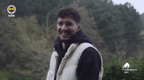 Altay Bayındır laughing heartily while wearing a black hoodie and white vest outdoors.