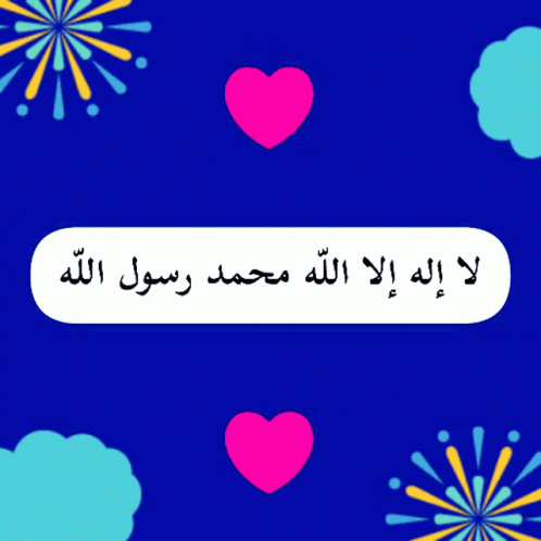 Blue background with hearts and fireworks, featuring the Islamic declaration of faith: 'There is no god but Allah, Muhammad is the messenger of Allah'.