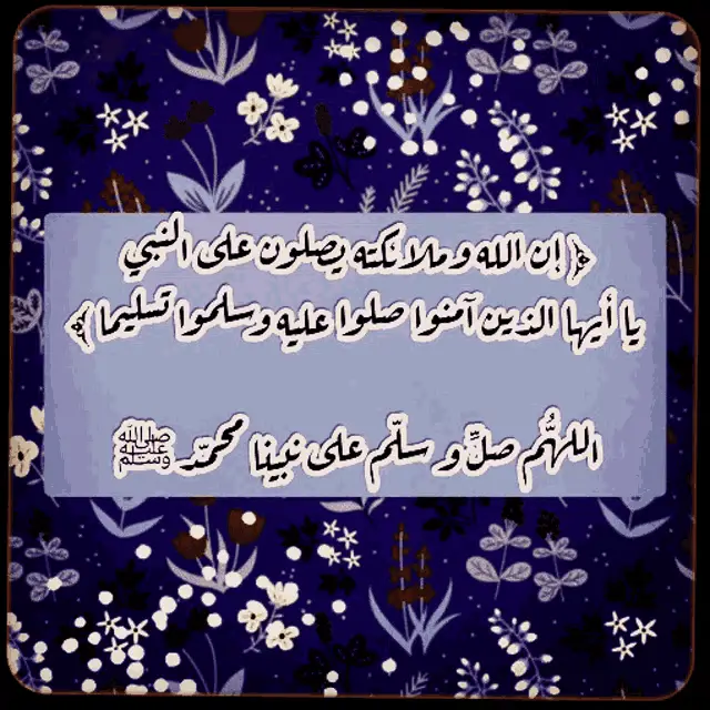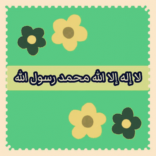 A green background with yellow flowers and the Islamic declaration of faith, 'There is no god but Allah, Muhammad is the messenger of Allah'.