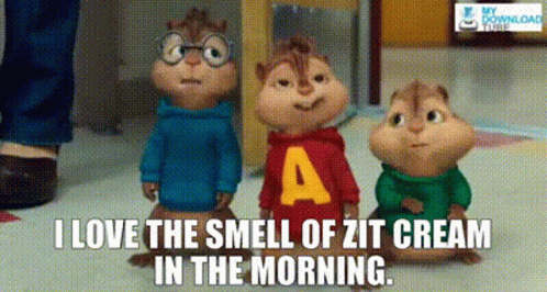 Alvin, Simon, and Theodore from Alvin and the Chipmunks with the quote 'I LOVE THE SMELL OF ZIT CREAM IN THE MORNING.'