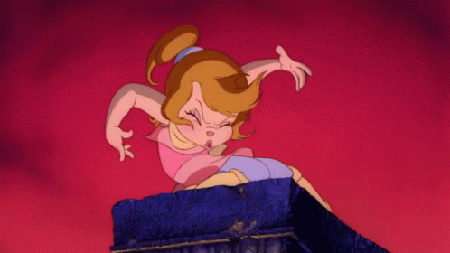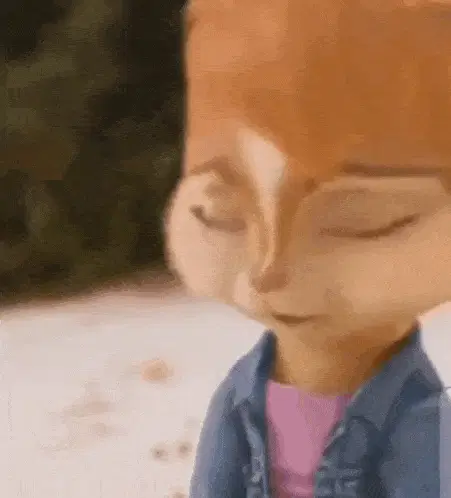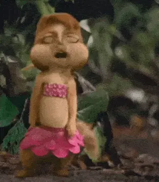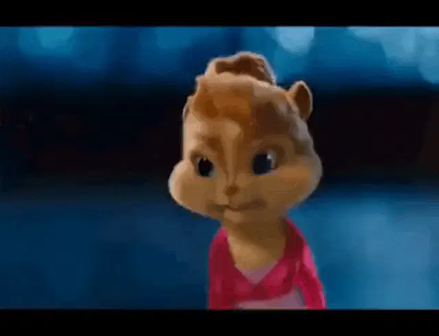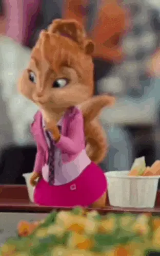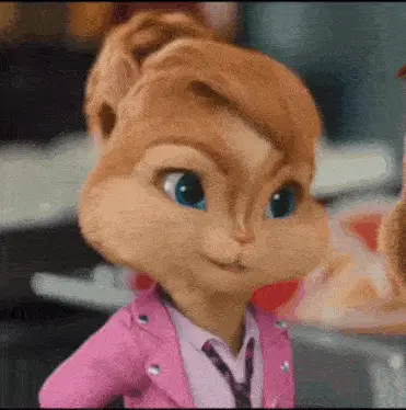 A Chipette from Alvin and the Chipmunks makes a funny face, sticking her tongue out while on a blue block.