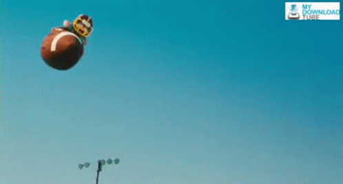 Alvin from Alvin And The Chipmunks, in a football helmet and giant football, floats in the sky and bounces on a field.