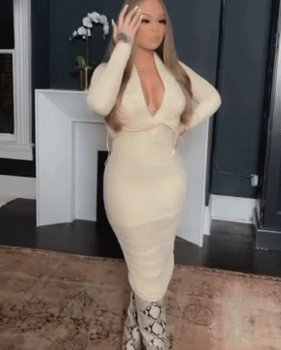 Alzolanskii Mulatto showcases a stylish cream midi dress with a deep V-neck and snakeskin boots, posing elegantly.