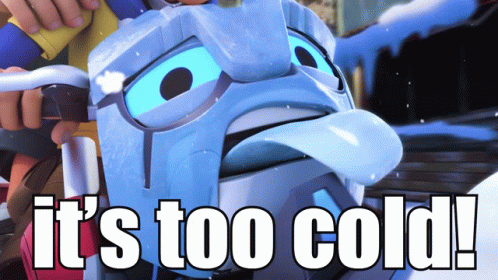 Amato Mechabot character shivering and exclaiming 'it's too cold!' in a snowy setting.