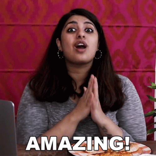 Sukanya enthusiastically claps her hands and exclaims 'AMAZING!' with a surprised and delighted expression.