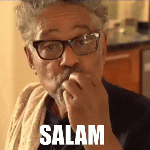 A man with glasses and a towel around his neck says 'Salam' in a popular Ambatukam Ambasing meme.